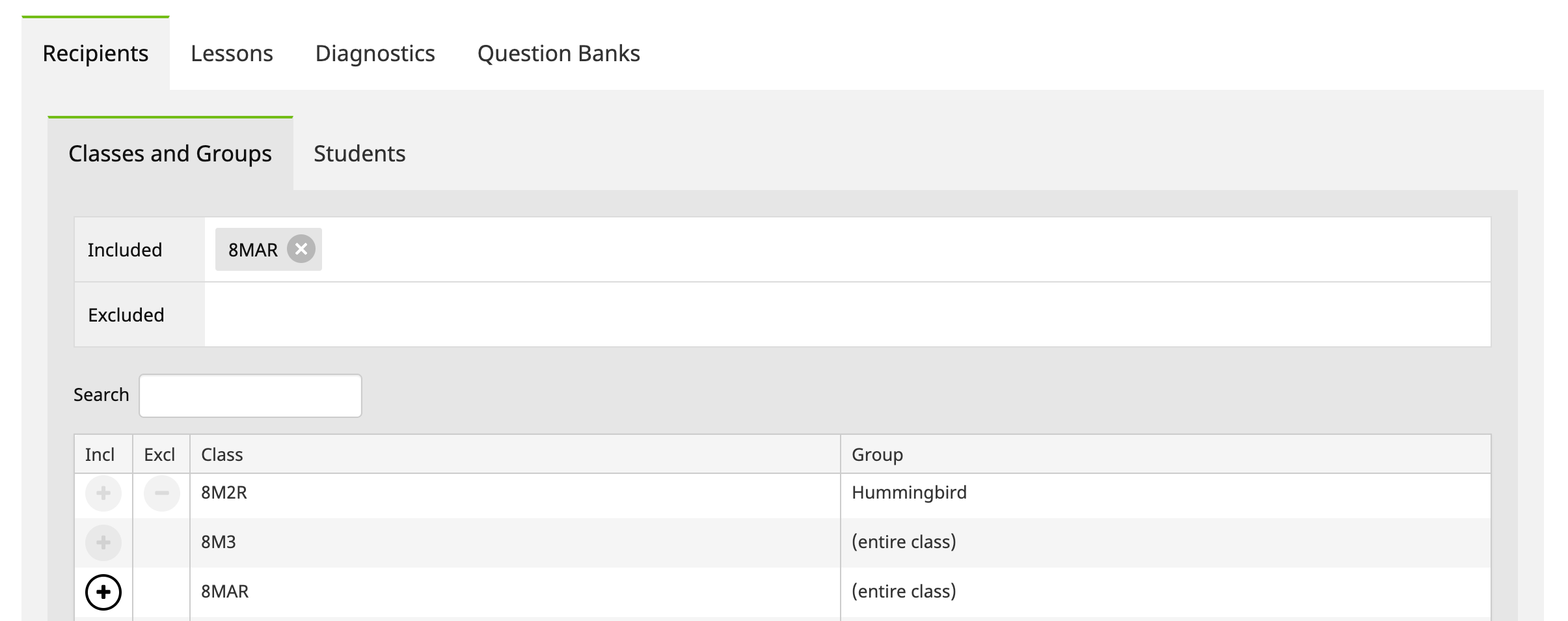 To select the Classes and Groups and/or Students to receive the activity, click ‘+ Add recipients’. Click ‘+’ or ‘-’ to include or exclude Classes and Groups and/or Students from the activity.